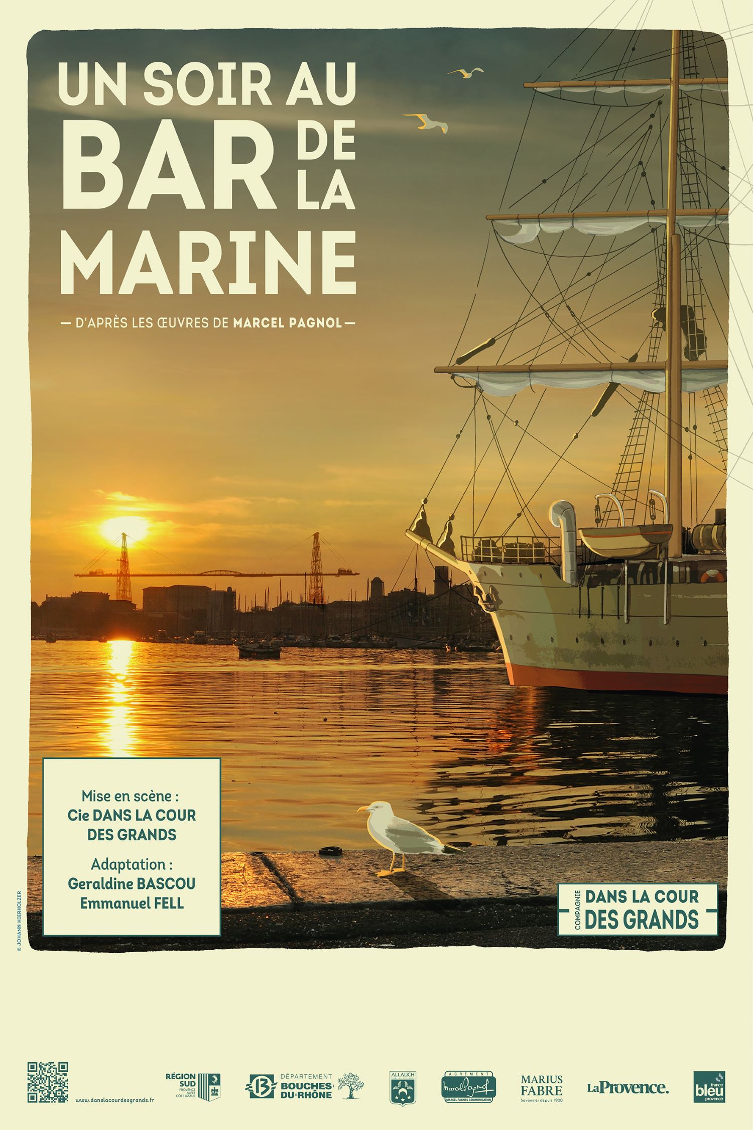 Marseille ! Sur les quais du vieux port, face au grand trois mâts qui revient des Antilles, Marius, Fanny, César et les autres naviguent au cœur des œuvres de la trilogie. Attablez-vous le temps d’une soirée, au Bar de la Marine. Partagez avec chacun d’eux du rire, de l’émotion, de la mauvaise foi, de l’exagération parfois, et de l’affection toujours. Avec un soir au bar de la marine la Compagnie Dans la cour des grands vous fait une promesse, celle d’un voyage à toute vapeur, au son du sifflet du Ferry-boat !